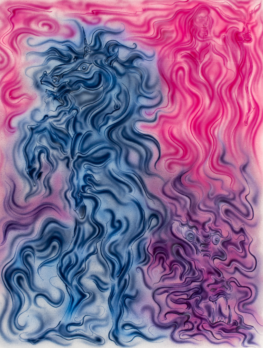 His practice is rooted in a fluid airbrush painting aesthetic that channels mythical and folklore narratives through an intensely personal lens. Rico’s work exists at the intersection of ancient symbolism and subconscious exploration. Each piece is a visual collision between collective memory and his own inner mythology, creating imagery that feels both primordial and contemporary.
